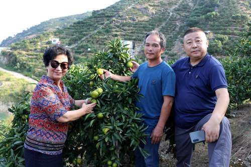 10月2日下午,白雁一行首先来到外岙村蜜桔种植户张万林家里,大家还没坐稳,他的夫人冯美桔就端上来满满的一盘蜜桔让大家品尝。她说:“欢迎远道而来的北京贵客来我们乡下调研,这盘蜜桔是上午刚刚摘下来的,你们品尝一下,肯定跟你们在北京吃的桔子不一样。”随后,大家品尝后,个个竖起了大拇指,用简单词语形容,那就是肉嫩、清香、甘甜。