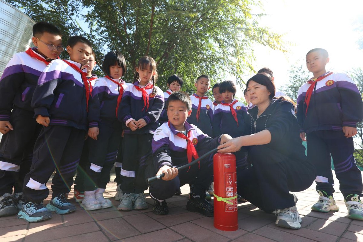 10月13日,在唐山市丰润区泉河头镇古石城小学,老师为学生讲解灭火器的使用方法。